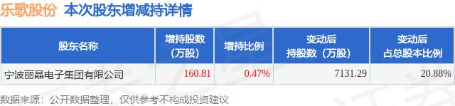 证券之星消息,12月9日乐歌股份发布公告《乐歌股份:关于公司控股股东增持公司股份触及1%整数倍的公告》股票配资最好的公司,其股东宁波丽晶电子集团有限公司于2025年11月24日至2025年12月8日间合计增持160.81万股,占公司目前总股本的0.4707%,变动期间该股股价上涨2.63%,截止12月8日收盘报14.06元。